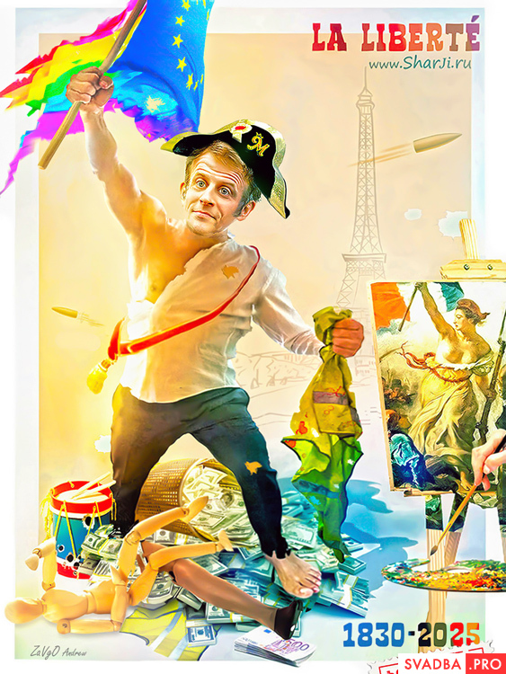 1830 Репродукция картины Делакруа «Свобода, ведущая народ на баррикады». 2024 «Макрон ведущий народ на Олимпиаду».